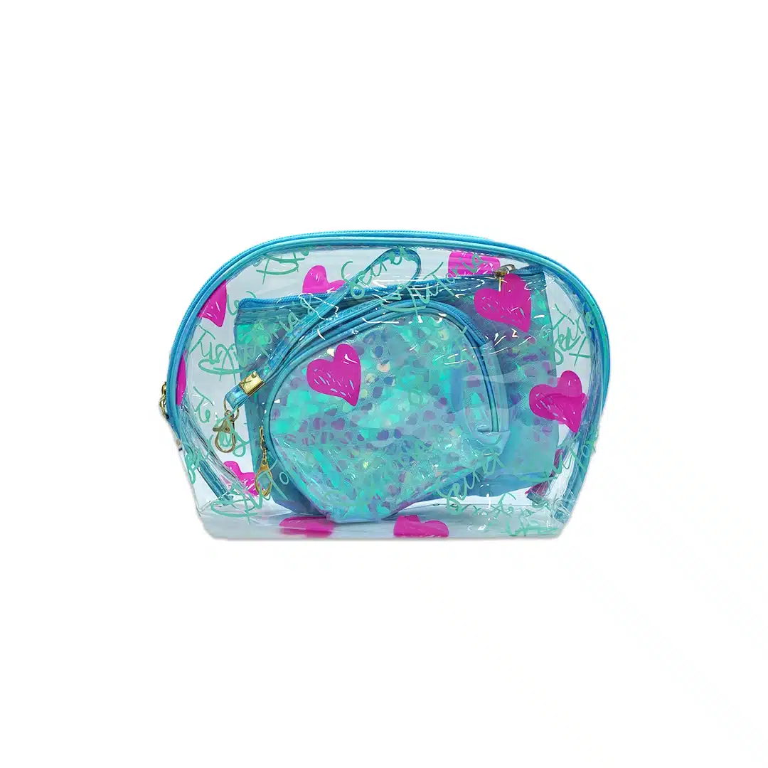 Set de cosmetiqueras en color celeste, perfectas para mantener organizados cosmรฉticos y accesorios.