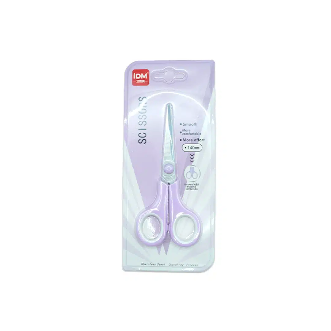 Tijera violeta de diseรฑo cรณmodo, ideal para tareas de oficina, escuela o manualidades.